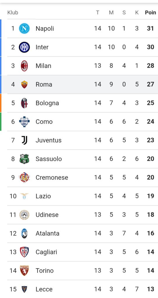 Berikut Klasemen sementara Serie A liga Italia pekan 14 2025/2026
