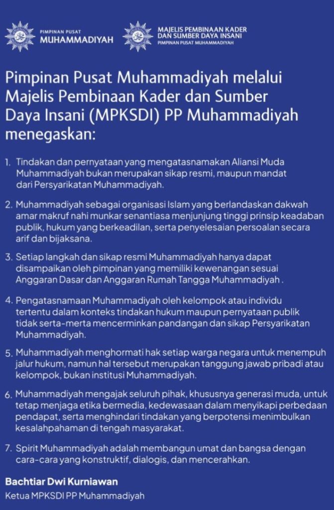 Ia menekankan bahwa penggunaan nama Muhammadiyah dalam tindakan hukum maupun pernyataan publik harus mengikuti mekanisme organisasi dan tidak bisa dilakukan tanpa mandat.