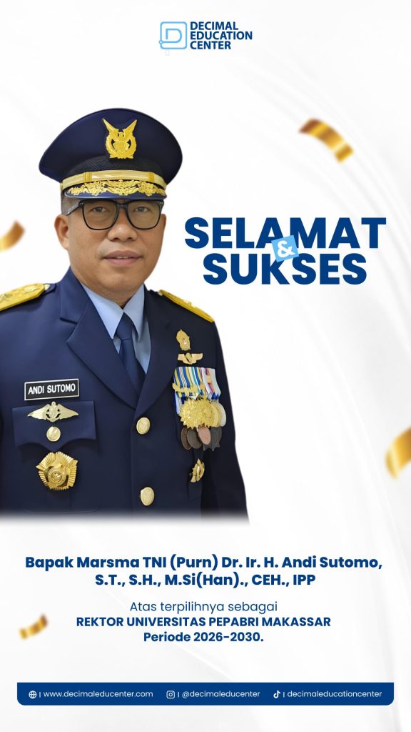 DECIMALNEWS.com – Marsma TNI (Purn) Dr. Ir H. Andi Sutomo S.T., S.H., M.Si (Han)., CEH., IPP resmi dilantik menjadi Rektor Pepabri Makassar periode 2026-2030 di salah satu Hotel di Kota Makassar, Rabu (01/04/2026).